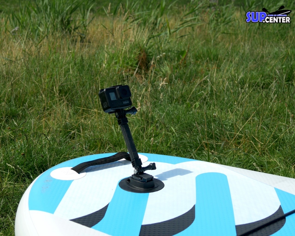 Das Bluemarina ARIKI bietet einige Features, die in dieser Preisklasse sonst nicht selbstverständlich sind. Wir haben nämlich an der Board-Spitze und am Heck einen weiteren Tragegriff. Zudem verfügt das Board an der Spitze über eine Action-Cam Halterung, in welche die klassischen Action-Cam Platten einfach eingeschoben werden können. Hinzu kommt ein 1/4-Gewinde, so dass eigentlich jede gängige Action-Cam an der Front ohne Aufwand befestigt werden kann. Hinzu kommt, dass wir vier zusätzliche D-Ringe auf der Standfläche haben auf welcher sich ein Kajak-Sitz befestigen lässt. Dieser ist allerdings nicht im Lieferumfang enthalten und kann bei Bedarf optional erworben werden. Die Tragegriffe fühlen sich leider beim Tragen nicht so angenehm an und drücken leicht auf die Hände. Zudem fehlt am Heck der D-Ring zur Befestigung der SUP-Leash. Entweder die Leash wird dann am Tragegriff befestigt oder an einen der D-Ringe auf der Standfläche, damit ein sicheres Paddeln gewährleistet ist.